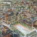 Skyline markt ‘s-Hertogenbosch,o.a. VVVkantoor en Hotel Central. Getekend en geschilderd met rietpen en penseel in Oost-Indische inkt en paynes grey inkt op linnen doek 40x120 cm.